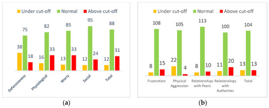 The RCMAS-2 test scores were divided into the scales described and identified in the Reynolds and Richmond manual [28]. The results showed that approximately 70% of the sample obtained an average total anxiety score, while approximately 20% obtained an above-average anxiety score (Figure 1a).