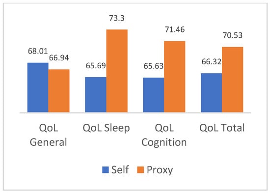 A paired-sample T-test was performed to compare the mean scores of the various areas of quality of life reported by children and adolescents with those reported by parents. Significant differences (p < 0.005) were found for the sleep area (t = −4.61, df = 130), the cognitive area (t = −2.91, df = 130), and the overall quality of life (t = −3.09, df = 130). Thus, the second objective of the study, which aimed to examine differences in the perception of quality of life between children and their parents, was confirmed. The results of the analysis are reported in Figure 2.
