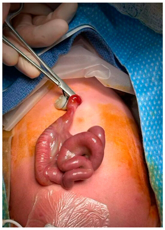 A 36-week female infant was born to a 23-year-old mother via vaginal delivery after induction of labor due to intrauterine growth restriction (11th percentile) and elevated Dopplers. Prenatal care was adequate, with antenatal ultrasounds revealing fetal gastroschisis. The infant’s APGAR scores at 1 and 5 min were 8 and 9, respectively, with routine care initiated upon birth. On examination, the infant had a very narrow gastroschisis defect with an extrusion of a short loop of intestine (Figure 1).