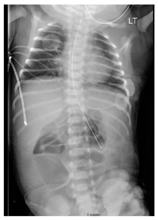 At 6 h of life, exploratory laparotomy confirmed a narrow gastroschisis defect with segmental ileal and colonic atresia. The surgical intervention included a 10 cm segmental ileal resection, colo-colonic anastomosis, ileal–ileal anastomosis, and closure of the gastroschisis defect, with an initial small intestine length of 30 inches. The infant was extubated to room air by 3rd day of life (DOL), and trophic feeds started on DOL 8. The infant had culture-positive sepsis on DOL 10, requiring ceftazidime for ten days and temporary cessation of feedings. Feedings resumed on DOL 15, reaching full enteral feeds by DOL 24. On DOL 25, the infant presented with bloody stools and AXR showing dilated intestines with pneumatosis (Figure 3), indicative of necrotizing enterocolitis (NEC), prompting another period of nil-per-oral status and antibiotic therapy. Feedings restarted on DOL 32 with hypoallergenic infant formula and advanced to full feeds by DOL 37 with the infant bottle feeding all the feeds.