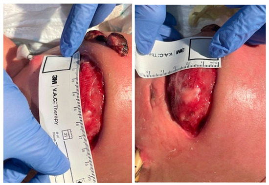 On DOL 60, the infant was transferred to a Level IV Children’s Hospital for advanced surgical management and intestinal rehabilitation to manage short gut syndrome. The defect in the abdomen post-ex-lap measured 8 cm × 3.5 cm with a matted bowel without breaks. (Figure 5). A negative pressure wound therapy with vacuum assist was placed on the abdominal defect and changed every five days, along with antimicrobial foam dressing on stoma sites. The infant remained on the nasogastric sump tube to low continuous suction. The infant completed a 21-day course of Meropenem.