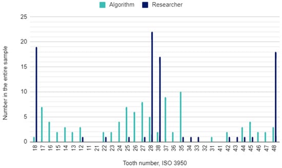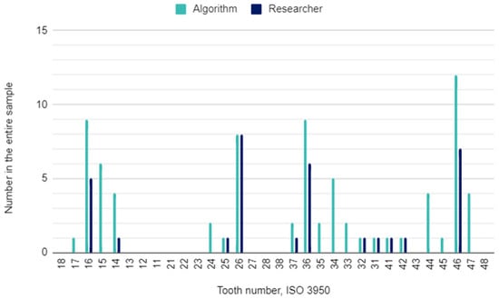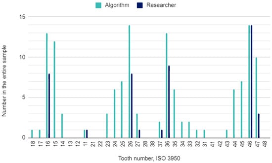 The principal investigator assessing DPRs had concerns in 22 (2%) of 1120 oral locations. In these cases, the initial assessment was verified by the other researcher. The raw results for individual variables and the results of the calculations of the sensitivity, specificity, accuracy, and precision of the AI algorithm are presented in Table 3. This table is a collective presentation of all tests with content corresponding to the STARD 2015 flow diagram [24]. The number of potentially eligible participants was equal to the eligible participants’ number and the tested participants’ number and was 35. There was no case of a missing reference standard. There were no inconclusive test results for either AI or human evaluation. The numbers of teeth identified by the AI and investigators for each diagnosis are presented in Figure 1, Figure 2 and Figure 3.