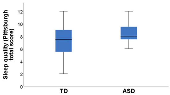 In our study, we found that the entire sample (100%) of participants with ASD had poor sleep quality according to their parents’ reports, while only 25% of the participants in the control group slept poorly. The difference between the two groups was statistically significant for sleep latency, total sleep duration, sleep efficiency, and sleep interruption. The sleep quality in ASD has been reported previously [6,8,10,46,47].