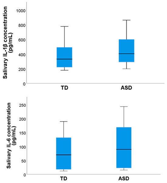 Salivary concentrations of IL-1β and IL-6 in the ASD and TD groups.