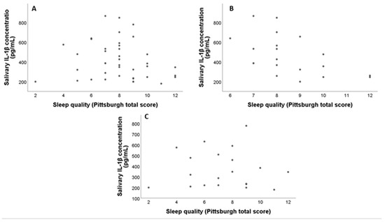 Among cytokines, concentrations of IL-1 beta and IL-6 in saliva have been reported as being significantly associated with poor sleep quality [22,27]. Although biomarkers of stress and inflammation have traditionally been studied in blood, salivary IL-1β and IL-6 are strongly correlated with blood levels [34,35,36]. After several days of sleep deprivation, IL-1β levels in the blood increase [37].To date, studies on the relationship between the salivary concentration of IL-1β and sleep disorders have not shown increased values for IL-1β [27].