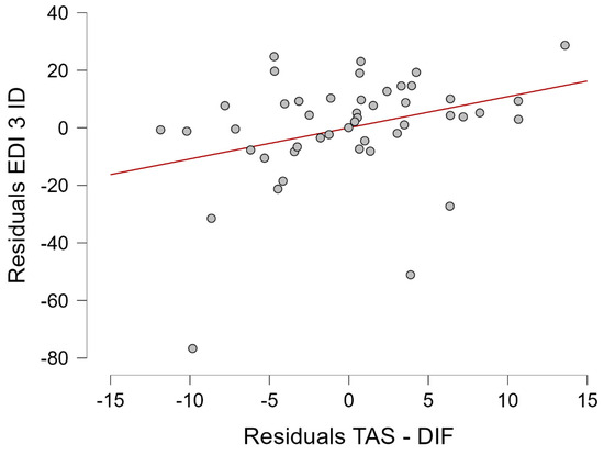 A linear regression assessing the potential predictors for EDI-3 Interoceptive Deficits documented a predictive model (F(5,46) = 2.756; p = 0.031; R2 = 0.252). After the regression process, TAS—Difficulty Identifying Feelings was retained as the sole predictor for EDI-3 Interoceptive Deficits (p = 0.030). The residuals for this linear regression are reported in Figure 1.