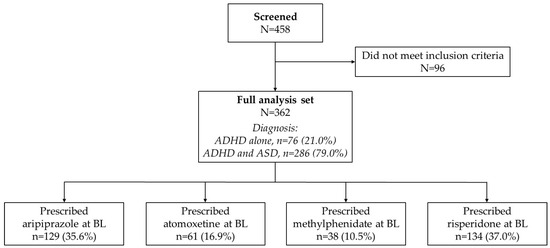 Patient disposition. ADHD, attention-deficit/hyperactivity disorder; ASD, autism spectrum disorder; BL, baseline.