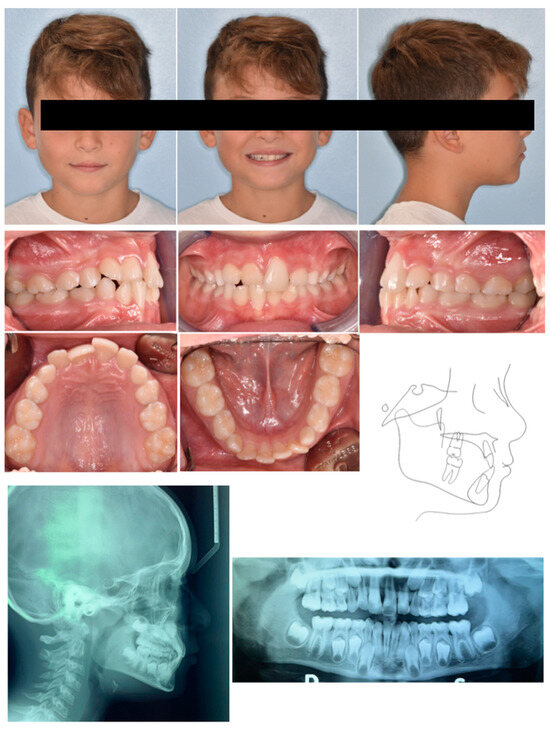 An 8-year-old male was referred by the pediatric dentists at a private practice for orthodontic evaluation due to parental concern regarding the retro-position of the right central incisor, while the child reported tension and pain in the incisor region while biting. The medical history was reviewed and no specific pathology was reported. Extraoral examination revealed the anterior crossbite of 11, although the poor teeth exposure at smiling mitigated the unaesthetic effect caused by the ectopic incisor position (Figure 5). The intraoral assessment showed a neutral occlusion, anterior crossbite 11–41, normal position of 21, and buccal inclination 41 with gingival recession and loss of attached gingiva (Figure 5). The panorex showed no evidence of carious or inflammatory lesions (Figure 5). Cephalometric analysis indicated a Class I skeletal relationship with a slight tendency towards Class III (primarily due to a morphological prominence of the symphysis), negative overjet, increased inter-incisal angle, and poor bone support of 41. All these parameters were consistent with the diagnosis of anterior dental crossbite (Figure 5).