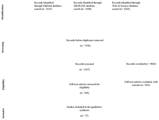 The search technique included searching several databases: PubMed (n = 2167), MEDLINE (n = 1698), and Web of Science (n = 3265). At first, the records were checked for duplicates, leaving 7130 distinct records. During the eligibility phase, 1267 records were reviewed, and 5863 records were eliminated based on the established criteria. Out of the records reviewed, 305 full-text articles were evaluated for eligibility, excluding 962 articles with indicated reasons. Seventy-seven papers met the criteria for inclusion in the qualitative synthesis.