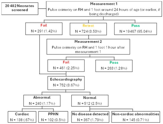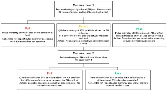 - Oster, M.E.; Pinto, N.M.; Pramanik, A.K.; Markowsky, A.; Schwartz, B.N.; Kemper, A.R.; Hom, L.A.; Martin, G.R.; The Section on Cardiology and Cardiac Surgery; Section On Hospital Medicine; et al. Newborn Screening for Critical Congenital Heart Disease: A New Algorithm and Other Updated Recommendations: Clinical Report. Pediatrics 2025, 155, e2024069667. [Google Scholar] [CrossRef]