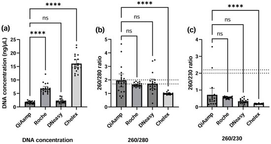 Figure 1. Bar plots (with scatter points) of spectrophotometric measurements of the DNA extracts using DeNovix DS-11. (a) The DNA concentrations in ng/µL, (b) the 260/280 purity ratio, and (c) the 260/230 purity ratio. The means are represented by the height of each bar, and the 95% CI are represented by the error bars. Each dot represents the mean of one DBS sample measured in triplicate. Horizontal dashed lines represent the ranges for 260/280 (1.7–2.0) and 260/230 purity (2.0–2.2) ratios that are generally considered to represent pure DNA. Statistical tests on all three quantities: one-way ANOVA for DNA concentration, and non-parametrical Friedman tests for 260/280 and 260/230, comparing each method against QIAamp as a reference with correction for multiple comparisons. ns = not significant, **** = p-value < 0.0001, CI = confidence interval.