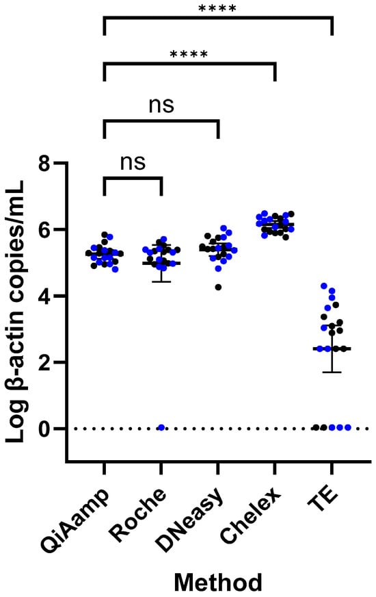 The ACTB concentrations of DNA extracted by the five different DNA extraction methods are depicted in Figure 2. Notably, the mean ACTB concentration of Chelex extracts (6.15 log10 copies/mL; CI 6.05−6.26) was significantly higher compared to that of QIAamp (5.26 log10 copies/mL; CI 5.13−5.39; p < 0.0001). Conversely, TE (2.41 log10 copies/mL; CI 1.70−3.11) yielded significantly (p < 0.0001) lower ACTB concentrations in comparison with QIAamp. The column-based methods Roche (4.98 log10 copies/mL; CI 4.43−5.54; p = 0.671) and DNeasy (5.40 log10 copies/mL; CI 5.21−5.58; p = 0.090) performed similarly compared to QIAamp. The older samples yielded similar DNA concentrations compared to the more recent samples, suggesting that DBS age may not play an important role in DNA recovery. None of the blank DBS extracts showed ACTB amplification.