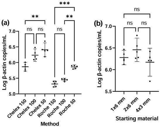 Figure 3. Strip plots with mean and 95% CI of ACTB qPCR concentrations (in log copies/mL) for the optimization of (a) Chelex and Roche elution volumes and (b) Chelex starting material. The means are represented by the middle horizontal lines, and the 95% CI are represented by the error bars. Each dot represents the mean of the duplicate qPCR measurement (log-transformed). Statistical test on ACTB: one-way ANOVA to make pairwise comparisons, corrected for multiple comparisons; ns = not significant, ** = p-value < 0.01, *** = p-value < 0.001, CI = confidence interval.