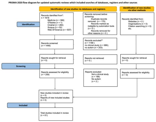 As reported in Figure 1, the total number of items retrieved from databases was 1618. Once duplicates were removed (170 searches), the full text of 259 articles was analyzed and 61 articles were included for qualitative synthesis.