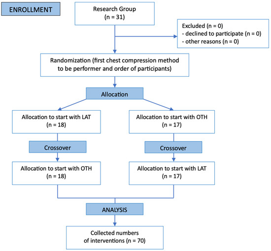 This research employed a randomized crossover design to assess the efficacy and performance of two juvenile chest compression techniques: the traditional LAT position and the OTH method. The inquiry was performed in a high-fidelity medical simulation facility, guaranteeing a controlled setting that accurately mirrored real-world pediatric resuscitation situations. Ethical approval was secured by the Institutional Review Board of the Polish Society of Disaster Medicine (IRB No. 45-2024-0312-IRB), and the study complied rigorously with worldwide ethical standards and best practices in clinical research.