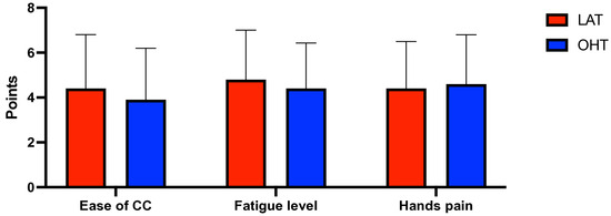 To evaluate the differences in performance parameters, a comparative analysis of two chest compressing techniques (LAT and OTH) was performed (Table 1). OTH demonstrated a higher overall performance score (72.94 vs. 64.46), with a trend toward significance (p = 0.08), suggesting a potential advantage (Figure 3). Compression frequency was slightly higher in Technique B (116.94 vs. 114.57; p = 0.31). LAT was rated as slightly easier (4.37 vs. 3.91; p = 0.17) and induced less fatigue (4.83 vs. 4.40; p = 0.24). Hand pain was marginally greater in OTH (4.57 vs. 4.43; p = 0.67), but differences were not statistically significant (Figure 4).