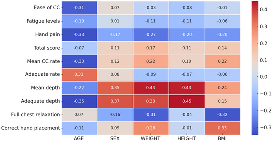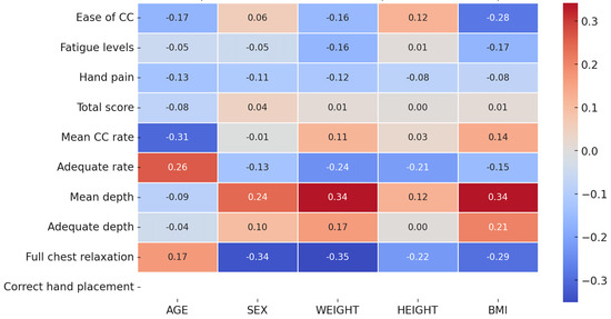 In the LAT technique, age was negatively correlated with ease of compression (r = −0.31) and mean compression rate (r = −0.33), meaning older participants found compressions more difficult and experienced greater discomfort (Figure 5). Male sex had a positive correlation with compression depth (r = 0.35) and correct depth of compression (r = 0.37), which indicates that males were able to achieve deeper compressions. BMI had positive weak correlations with compression depth (r = 0.24) and correct hand position (r = 0.33), and weight had a moderate correlation with compression depth (r = 0.43).