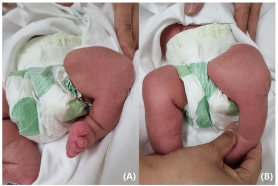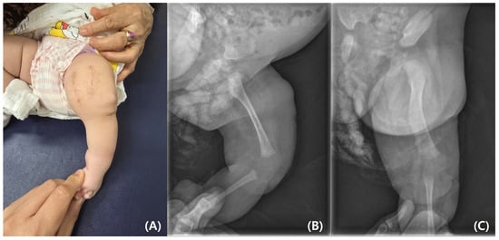 A 2-month-old female, born at 38 weeks via cesarean delivery because of breech presentation, was referred to our pediatric orthopedic clinic for the evaluation of a left femur and knee anomaly. The pregnancy was unremarkable, with regular ultrasound screenings. The infant was the first child of a 19-year-old Korean primigravida mother. The mother reported no history of drug, alcohol, or tobacco use, nor any diabetes mellitus or infections during pregnancy. No family history of consanguinity, birth defects, congenital abnormalities, or limb deficiencies were recorded.