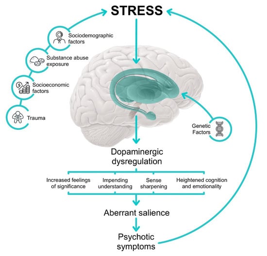 Psychosis is characterized by a disturbance in reality testing, often marked by delusions (false beliefs resistant to logic) and hallucinations (hyper-reflexivity), manifesting as a result of dopaminergic dysregulation. In psychosis, dopamine misguides salience attribution, causing individuals to give inappropriate significance to both external stimuli and internal representations. The continuous misattribution of salience, even in the absence of concrete external stimuli, is a hallmark of psychotic experiences, as represented in Figure 1. Delusions represent cognitive explanations constructed by the individual to restore coherence to their perception of the world, while hallucinations are the result of misattribution of salience to perceptions or memories. Delusional thinking provides the individual with a sense of relief from earlier anguish, as they form a new cognitive and behavioral framework that validates their beliefs. These patients may exhibit altered probabilistic reasoning, perceptual distortions, and magical thinking, with psychotic phenomena originating from neurobiological and psychodynamic abnormalities [].