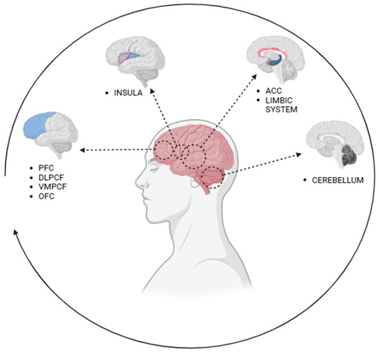 Emotions and human behavior are complex processes that involve several interconnected brain areas (Table 1). The main brain regions involved in the regulation of emotions and behaviors include the prefrontal cortex, the anterior cingulate cortex, the insula, the cerebellum, and the limbic system, as described in Figure 1 [7].