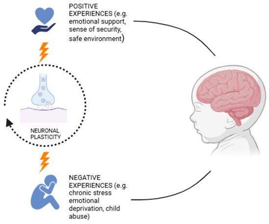 Sensory, emotional, and cognitive experiences actively shape the structure and function of a child’s brain. Plasticity allows for a high degree of adaptability, supporting the development of effective emotional regulation strategies and the ability to recognize and interpret both one’s own emotions and those of others [75,76]. Positive experiences, such as emotional support and a sense of security, help build resilient neural circuits, foster emotional stability, and reduce susceptibility to mood disorders [77]. Conversely, exposure to chronic stress or emotional deprivation can lead to altered synaptic plasticity, increasing the risk of anxiety, depression, and difficulties in emotional regulation, as described in Figure 2 [78,79,80,81,82,83]. Self-dissatisfaction can influence brain neuroplasticity, which, in turn, affects self-perception [84]. Induced neuroinflammation, for example, from COVID-19, could alter microglial cell function, impairing brain plasticity and contributing to learning difficulties and neurodevelopmental disorders. This occurs through a reduction in brain-derived neurotrophic factor (BDNF), alteration an in communication between immune cells and microglia, increased inflammatory molecules, and the disruption of crucial signaling pathways for synaptic plasticity [85,86]. However, brain plasticity in childhood also offers recovery opportunities, enabling targeted therapeutic interventions to strengthen neural connections related to emotional well-being [87]. A key aspect of childhood plasticity is its compensatory ability [88,89]. If a brain region responsible for emotional regulation suffers a deficit, other regions may step in to support these functions, making effective adaptation possible. This property is essential for early interventions aimed at children with emotional difficulties, allowing the modulation of responses through educational and therapeutic strategies based on neuroplasticity. After the early years of life, neuroplasticity begins to slow down [90]. This property is essential for early interventions aimed at children with emotional difficulties, allowing emotional responses to be modulated through educational and therapeutic strategies based on neuroplasticity.