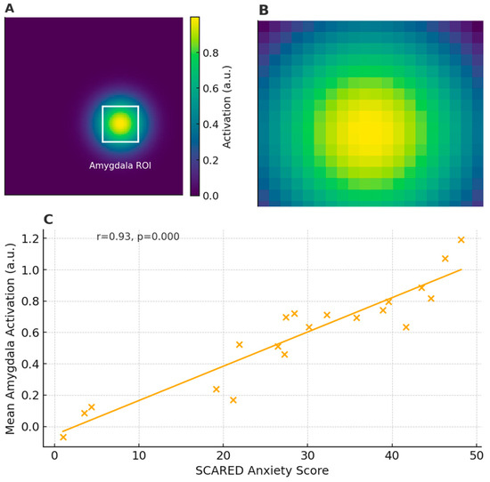 In this figure, the amygdala ROI (Region of Interest) refers to a rectangular zone placed over the amygdala, which plays a key role in processing emotions such as fear and anxiety. By averaging the BOLD (blood-oxygen-level-dependent) signal within this ROI, researchers obtain a single value (e.g., mean activation intensity) that reflects how strongly the amygdala responds during the task across each subject. This approach reduces noise from other brain regions and allows a direct comparison between subjects or conditions. The Screen for Child Anxiety-Related Emotional Disorders (SCARED) is a standardized, parent- and/or self-report questionnaire used to assess symptoms of anxiety in children and adolescents. It consists of 41 items across five subscales (panic/somatic, generalized anxiety, separation anxiety, social phobia, and school phobia), each rated on a three-point scale (0 = “Not True or Hardly Ever True”, 1 = “Somewhat True or Sometimes True”, 2 = “Very True or Often True”). The total scores range from 0 to 82, with higher scores indicating greater anxiety symptomatology. In the scatterplot (Panel C), each child’s total SCARED score is plotted against their mean amygdala activation, allowing us to see how neural reactivity relates to clinically assessed anxiety levels. A strong positive correlation (r = 0.93, p < 0.001) suggests that children reporting more anxiety symptoms also exhibit higher amygdala responses during the emotional-processing task.