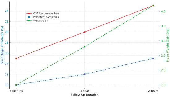 Persistent symptoms, such as snoring, daytime fatigue, and mild respiratory disturbances, were also reported. These symptoms were not attributable to other comorbid conditions and, according to parental reports, were not present before the surgery. Their prevalence increased over time, from 10% at 6 months to 15% at 2 years postoperatively, indicating the need for ongoing symptom monitoring [61].