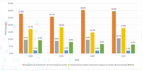 In this sample, only 36.8% of adolescents with CUD completed their treatment (Table 1). Figure 1 shows that treatment completion remained about the same from 2018 to 2021, ranging from 36.9% in 2019 to 33.8% in 2021, which constituted the lowest completion percentage in this period. The most common reasons for not completing treatment in all years were dropping out of treatment (28.4%), transferring to another facility (17.0%), and being terminated by the facility (9.7%) (Figure 2).