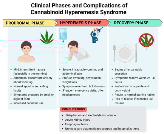 Clinical phases and complications of cannabinoid hyperemesis syndrome—created in BioRender. Pietrantoni, C. (2025) https://BioRender.com/bq3w7xu (accessed on 1 July 2025).
