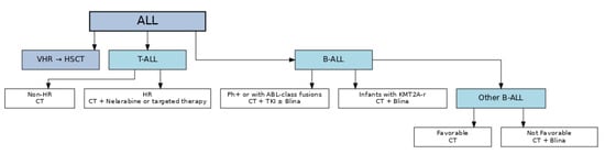 Advancements in genomic profiling have identified specific genetic mutations and fusions in ALL, paving the way for targeted therapies. Comprehensive genomic analyses have revealed that approximately 80–90% of ALL cases harbor potentially targetable genetic alterations [76,77,78]. The estimated potential use of innovative agents and current approaches in frontline therapy are summarized in Table 2 and in Figure 1, respectively.