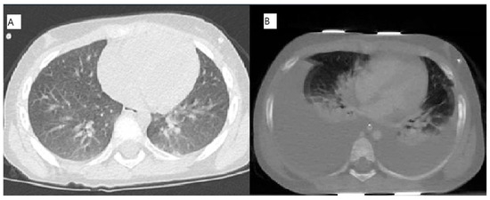 A ten-year-old male received a diagnosis of Early T-cell precursor (ETP)-ALL and was enrolled in AIEOP-BFM ALL 2017 protocol. In his clinical history, he presented recurrent respiratory symptoms, such as cough and bronchospasm treated with inhalation therapy. The evaluation of d + 15 BMA showed 80% lymphoblasts with ETP-ALL immunophenotype, compatible with high risk. During the induction protocol IA, he presented with SARS-CoV-2 and H1N1 infections leading to a prolonged hospitalization, but without any side effects. During the induction protocol IB, he was admitted to our center for febrile neutropenia. A polymerase chain reaction (PCR) analysis using a respiratory swab was performed, which showed positivity for RSV. In particular, respiratory pathogens were detected using the BioFire® FilmArray® Respiratory Panel (bioMérieux, Marcy-l’Étoile, France), a multiplex PCR-based system that simultaneously identifies multiple respiratory viruses and bacteria from a single nasopharyngeal swab. The system provides automated extraction, amplification, and detection, and delivers results within approximately one hour. At the hospital, he presented with high fever (40 °C) and mild respiratory involvement (92–93% oxygen saturation (OS)). Therefore, an antibiotic therapy with cephalosporine and an oxygen support with nasal cannulas was started. Furthermore, he underwent a chest X-ray and subsequently a chest CT, which showed multiple parenchymal thickenings with a partly consolidative and partly ground glass appearance in both lungs and diffuse thickening of the peribronchovascular interstitium (Figure 2A). Because of the worsening of his general conditions with the persistence of fever and desaturation episodes (84–85% OS) leading to severe respiratory failure, he was supported with high flow nasal cannula (HFNC) and then with continuous positive airway pressure (CPAP) and non-invasive ventilation (NIV). Drug therapy was modified by adding systemic steroid and granulocyte colony-stimulating factor (G-CSF) and by replacing cephalosporin with meropenem, even when the blood cultures were negative. Furthermore, immunoglobulin infusion and blood and platelet transfusions were administered as support therapy.