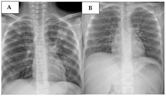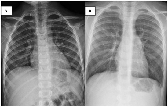 They were almost simultaneously hospitalized because of febrile neutropenia, cough, and mild respiratory involvement (95–96% OS) without any respiratory support necessity. They showed positivity for RVS in the BioFire® FilmArray® Respiratory Panel (encompassing many viruses, such as adenovirus, coronavirus, rhinovirus, enterovirus, metapneumovirus, influenza, parainfluenza, and RSV) and the chest X-ray detected a slight accentuation of the peribronchovascular texture (Figure 3A,B). Treatment with cephalosporine and inhalator therapy were started, and preparations of immunoglobulin were used because of a decreased immunoglobulin concentration. After a few days the general conditions improved, and both patients recovered, enabling them to continue the chemotherapy protocol.
