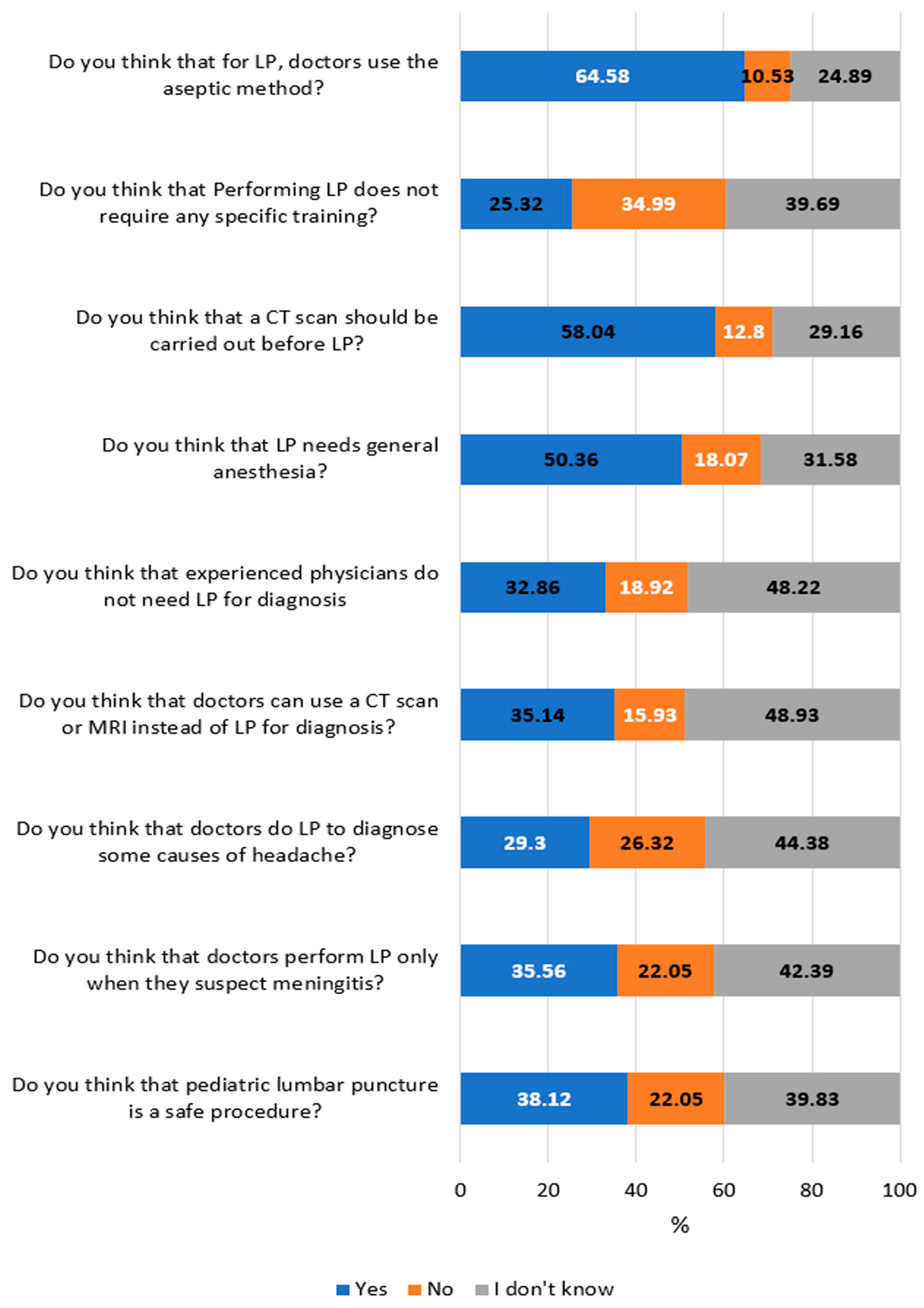 Figure 1 illustrates parents’ responses to questions regarding their awareness and knowledge of pediatric LPs. Most parents know that doctors use an aseptic method for LP (64.58%), and only 38.12% thought that LP is a safe procedure. Regarding training to perform LP, 34.99% did not agree that LP does not require specific training. Two hundred and fifty parents reported that doctors perform LP only when they suspect meningitis, and two hundred and six parents thought that doctors perform LP to diagnose some types of headaches. Only 12.80% of respondents believed that a computed tomography (CT) scan should not be performed before LP. Additionally, 15.93% believed CT scans or MRIs could replace LP, 18.07% believed LP required general anesthesia, and 18.92% believed experienced physicians could diagnose without LP. The overall knowledge score ranged between 0 and 9, with low scores (the lower 33.33%, scores ≤ 3) accounting for 62.87%, moderate scores (33.33–66.66%, scores = 4–6) accounting for 34.57%, and the high scores (>66.66%, scores > 6) accounting for 2.56%.