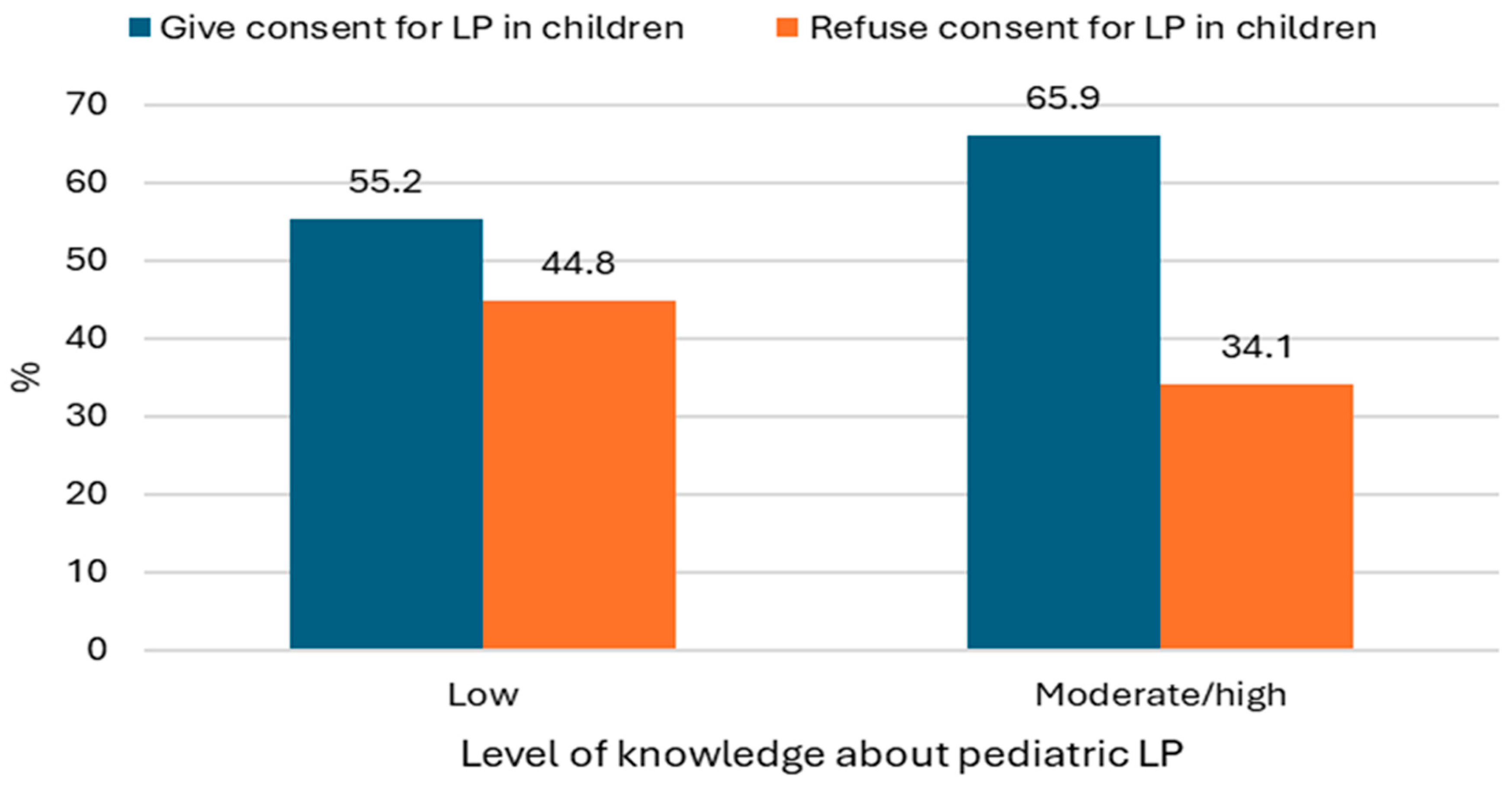 Parents who demonstrated moderate to high knowledge about pediatric LP were more likely to consent to LP in their children (p = 0.005) (Figure 3).