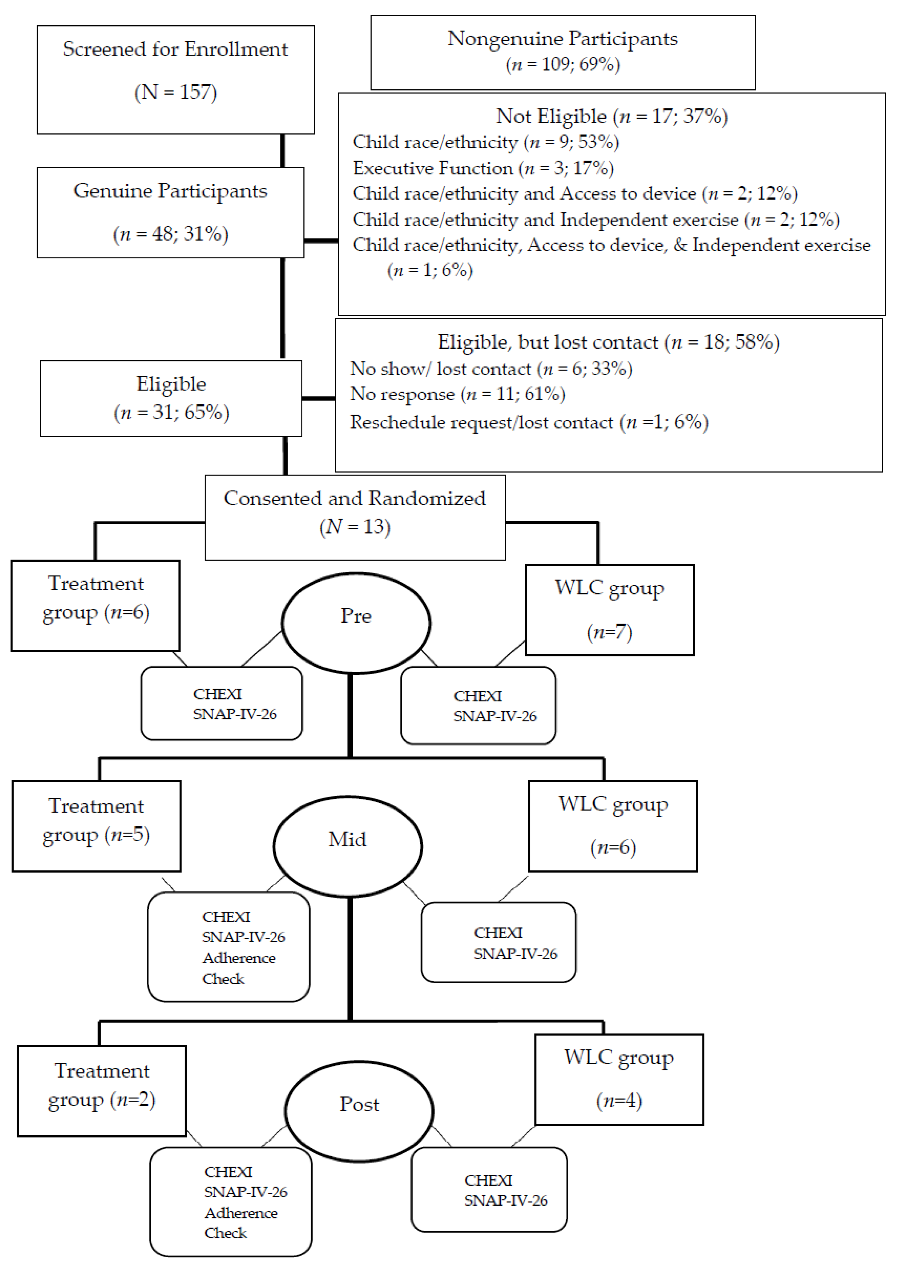 Table 1. Eleven of the thirteen completed half of their assigned condition, allowing for an exploratory analysis on the impact of treatment from pre- to mid-treatment. Further, only six of the original thirteen participants completed the entirety of their 12-week condition: two children in the treatment group and four in the WLC.