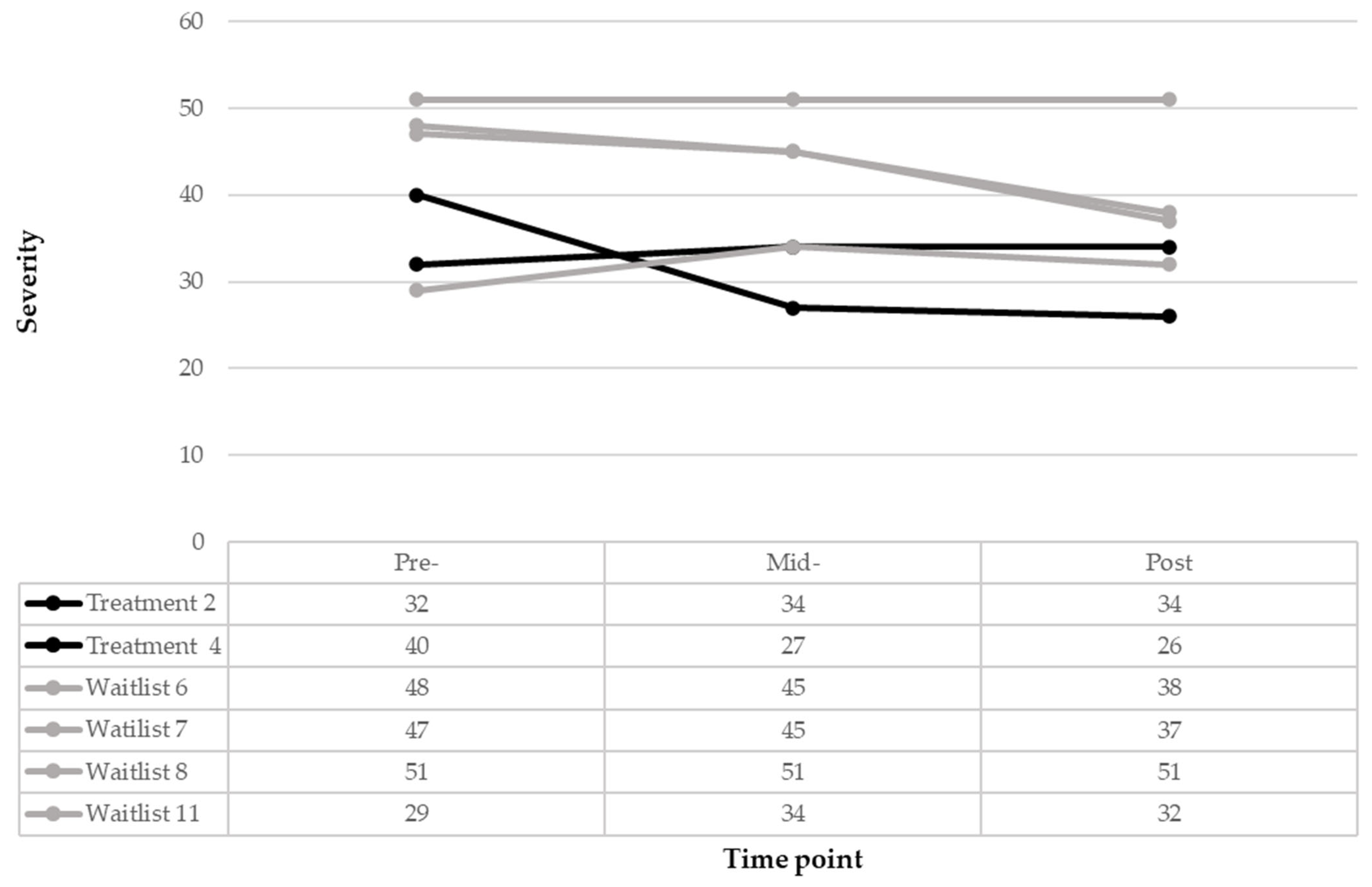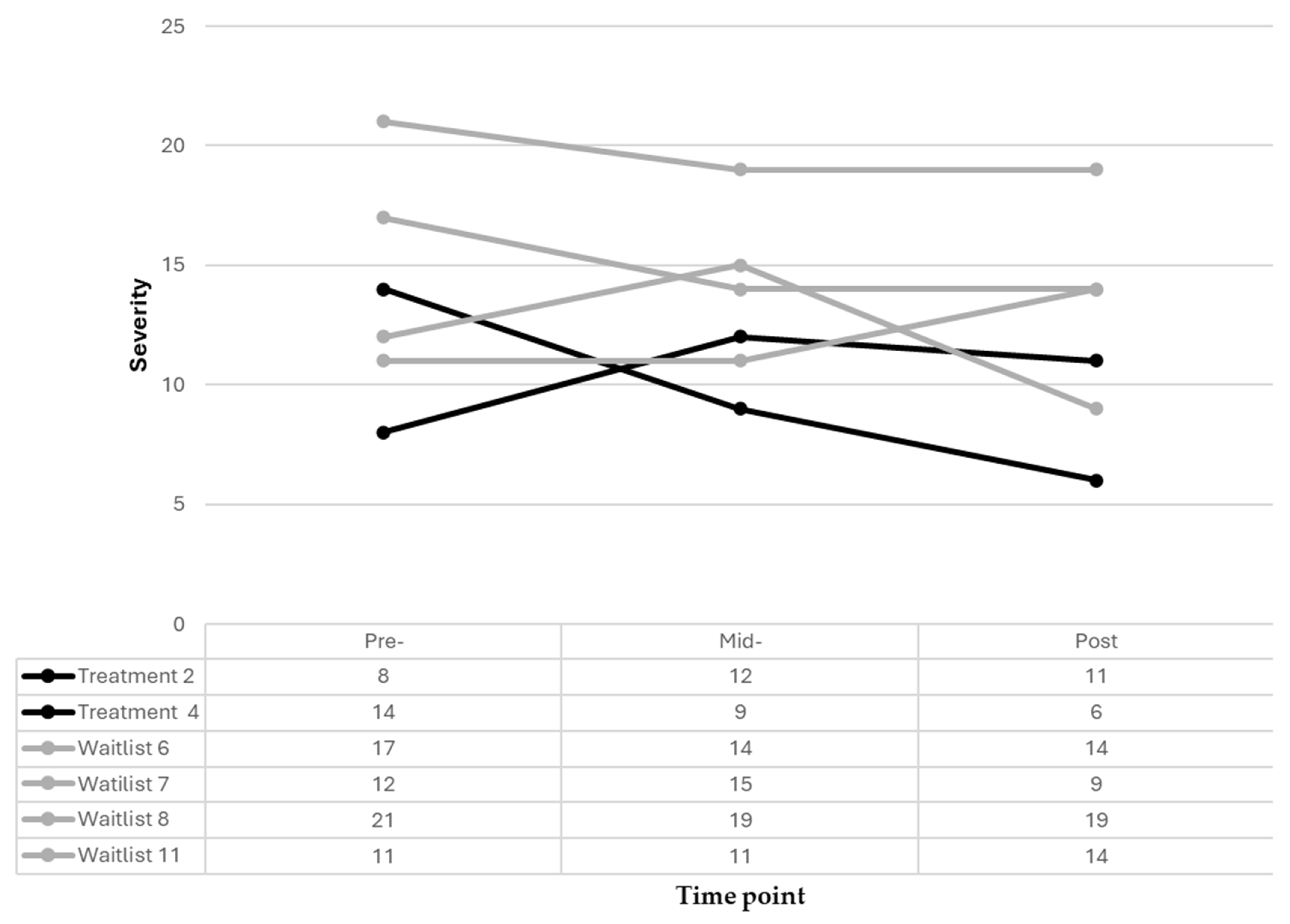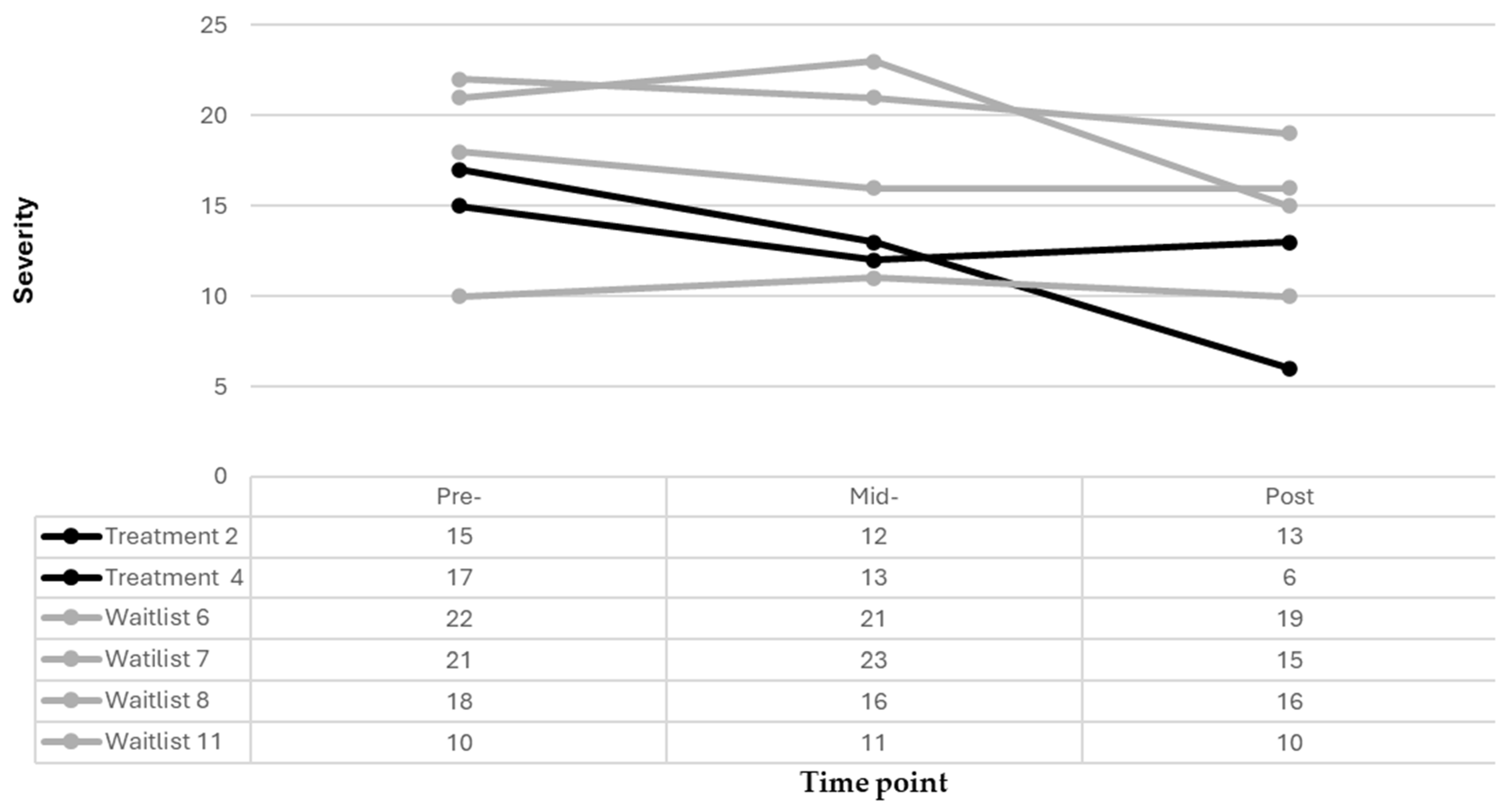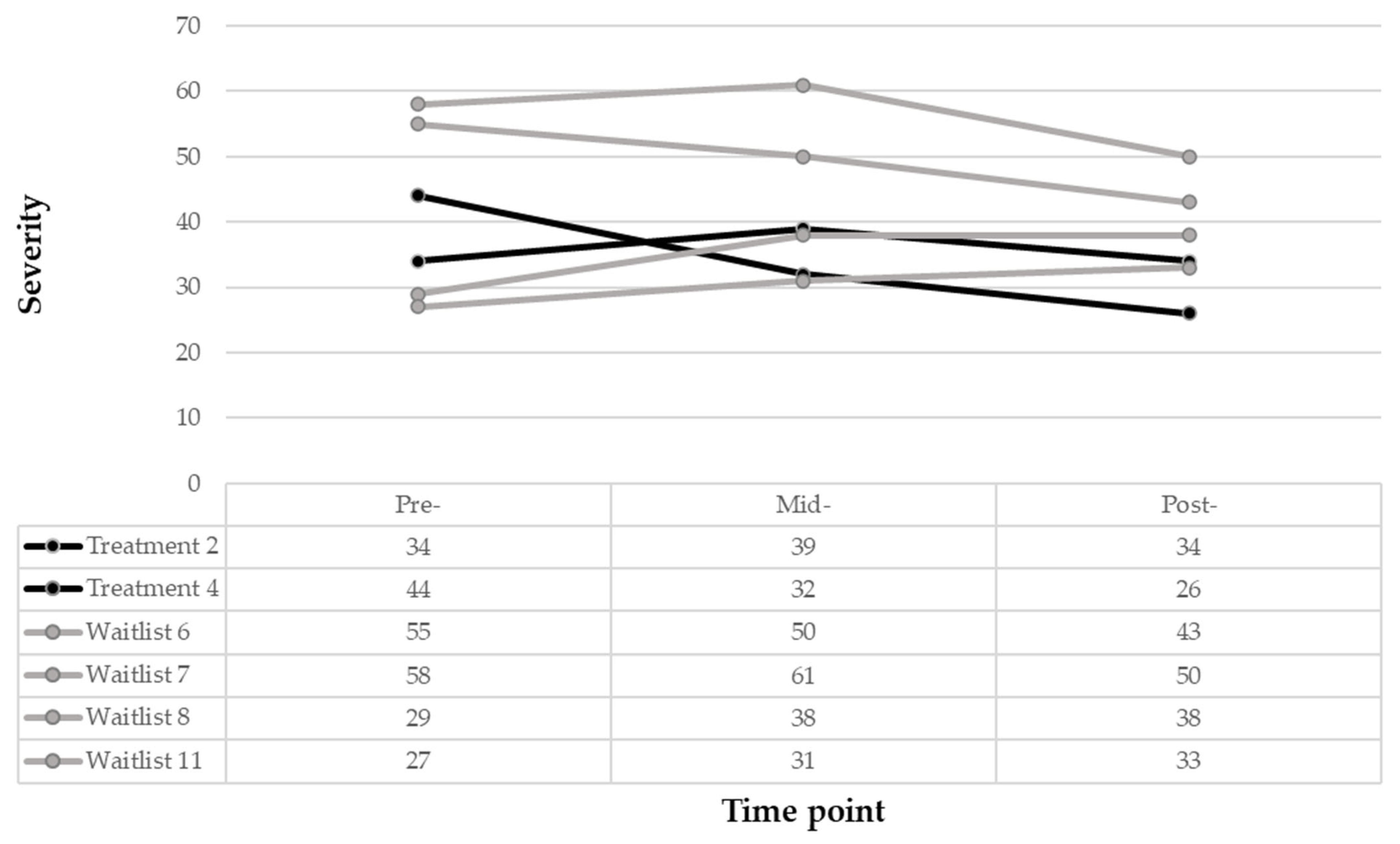 n = 11) at the 6-week timepoint. To further understand the individual pre-, mid- and post-treatment trajectories for those who completed their conditions (
