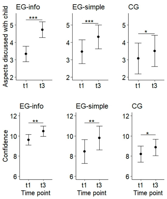| t1, t2 | Confidence | Confidence regarding 3 subjects (media education, finding information regarding media education, applications for secure use) Response options: not at all (1); rather not (2); rather yes (3); totally (4) | Sum score (range 3–12, higher scores indicate more confidence) a |