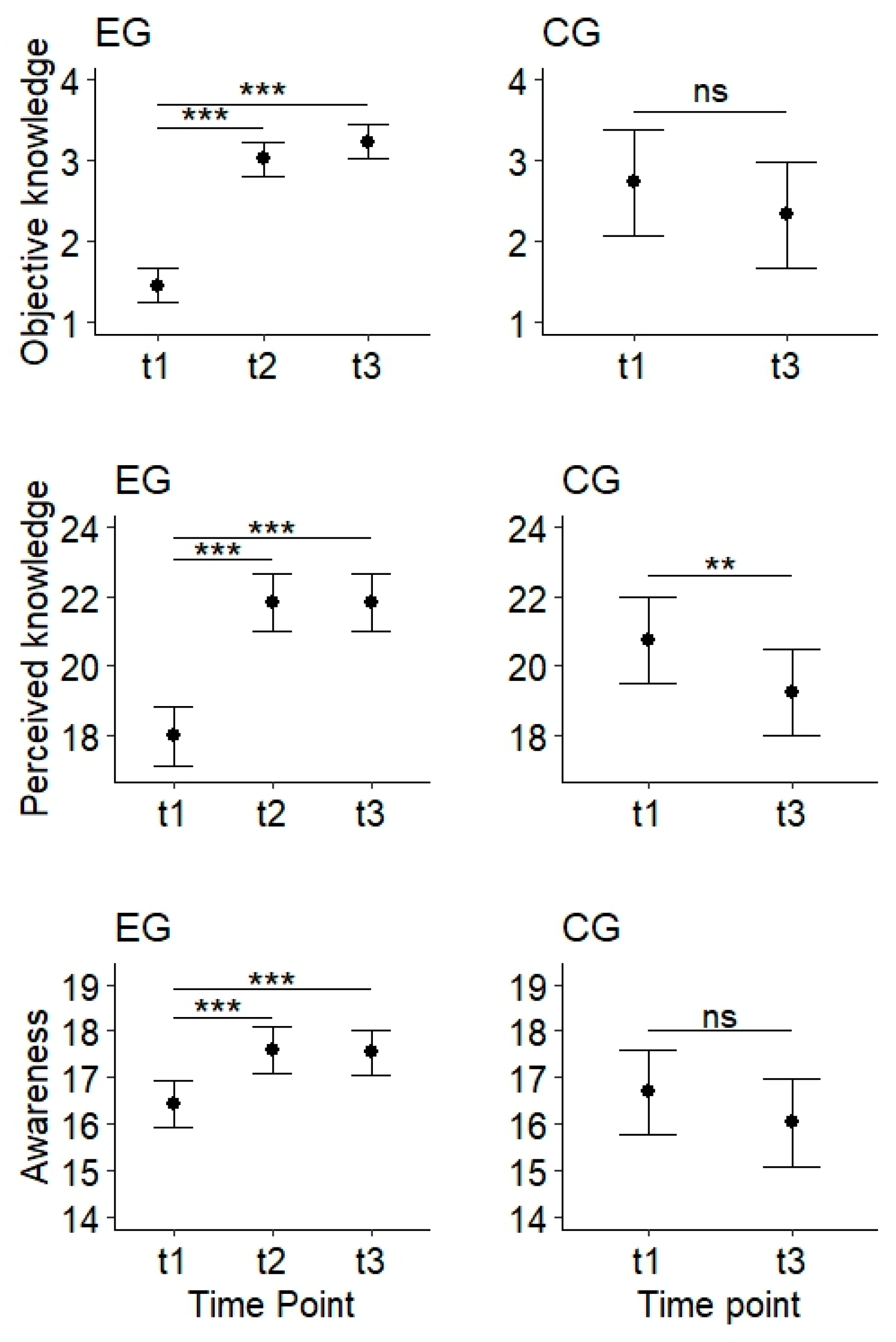 Differences between EG and CG at t1 and t3 regarding perceived knowledge, objective knowledge, and awareness as well as differences between t1, (t2), and t3 in both groups are shown in Table 5.