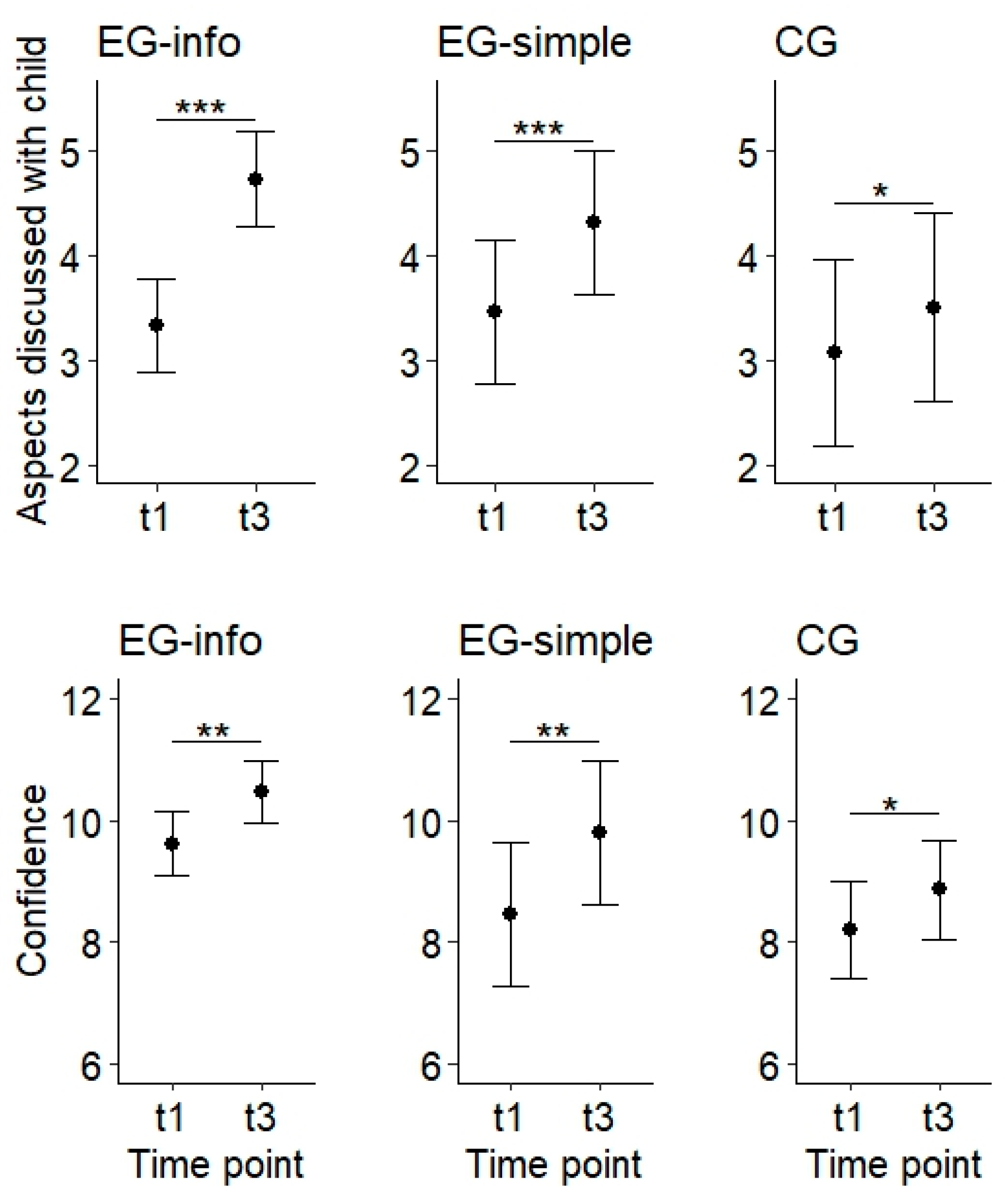 Table 6 shows the differences between EG-info, EG-simple and CG at t1 and t3 regarding the number of aspects discussed with the child and confidence, as well as differences between t1 and t3 in all groups.