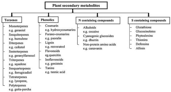 There are three major classes of plant metabolites (Figure 1) based on the biosynthetic pathway: (i) phenolic groups (composed of simple sugars and benzene rings), (ii) terpenes and steroids (composed mainly of carbon and hydrogen), and (iii) nitrogen-containing compounds [11].