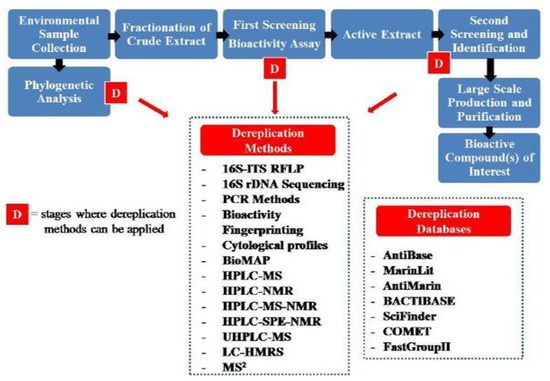 To identify the desired secondary metabolites, the pure compound is separated from the mixture and identified through chromatographic and non-chromatographic techniques. Chromatographic techniques are used in both the separation and/or identification of the active components in a mixture. Chromatographic techniques are used on an industrial scale and/or for academic purposes to separate and purify the products in various syntheses. There are various chromatography techniques, from the simplest thin-layer chromatography (TLC) to advanced gas chromatography and liquid chromatography with mass spectroscopy [14,34].
