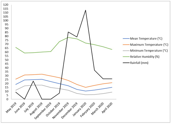 Leaf samples of six olive varieties (‘Amfissis’, ‘Chondrolia Chalkidikis’, ‘Kalamon’, ‘Koroneiki’, ‘Mastoidis’, and ‘Picual’) were employed for this study in 2019 and 2020. Rainfed, 50 year-old olive trees spaced at 8 × 8 m and grown at the National Olive Germplasm Bank of Greece, located at Chrisopigi area (35°29′24″ N, 24°01′33″ E) near the Institute of Olive Tree, Subtropical Crops and Viticulture, ELGO-DIMITRA (Chania, Crete, Greece), were selected for the experiment. The mean air temperature was 17.8 °C, relative humidity was 69.6%, and annual rainfall was 680 mm in 2019. The hottest month of 2019 was August, with a mean atmospheric temperature of 25.2 °C. February was the coldest month, with an average temperature of 10.3 °C. The mean annual rainfall in 2019 was 680.8 mm. The highest rainfall in 2019 was observed in February, with an average of 334.6 mm, while the driest months were June, August, and September at 0 mm. The mean air temperature was 18.6 °C, relative humidity was 62.2%, and annual rainfall was 558 mm in 2020. The hottest month of 2020 was August, with a mean atmospheric temperature of 26.6 °C. January was the coldest month, with an average temperature of 10.4 °C. The mean annual rainfall in 2020 was 558.4 mm. The highest rainfall in 2020 was observed in October, with an average of 196.4 mm, while the driest months were June, August, and September at 0 mm (ELGO-DIMITRA meteorological station, Chania, Greece). Meteorological data are presented in Figure 1.