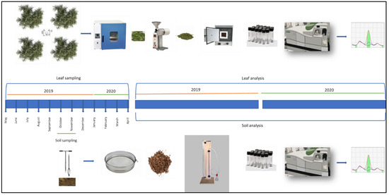 Leaf samples were collected every month from May 2019 to April 2020, representing the annual cycle during an “off” year (2019 yield). Each variety was represented by three blocks (replications), each with four olive trees. A sample of 100 leaves consisting of the third and fourth pairs of fully expanded leaves, starting from the top of the shoot, was collected once a month per experimental block, then was washed with distilled water and dried at 65 °C to a constant weight prior to fine grinding with a mill (Figure 2). Ground samples (1 g) were dry ashed (520 °C for 5 h), then dissolved with 1M HCl (1:4) with mild heating (50–60 °C), prior to being filtered and diluted to 25 mL. Concentrations of Ca, Fe, and Mn in plant tissue were measured by ICP-OES (Optima 8300, PerkinElmer, Waltham, MA, USA). Element concentrations in plant tissue were then calculated as mg kg−1 d.w. (ppm).