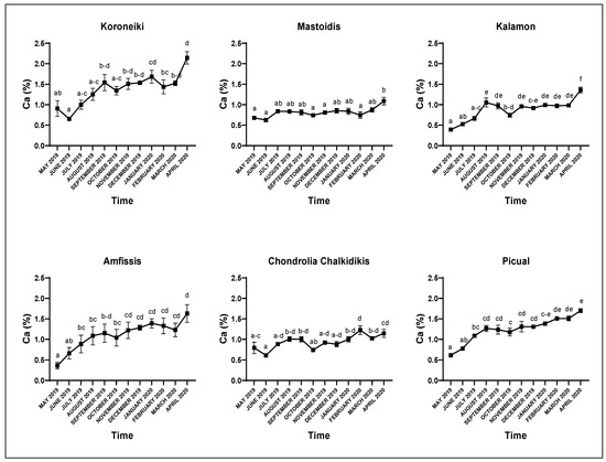 Leaf Ca concentration increased progressively from May to September, with an instant decrease in June for ‘Koroneiki’, ‘Mastoidis’, and ‘Chondrolia Chalkidikis’. We detected a decrease in October, followed by an increase until January for ‘Koroneiki’, ‘Mastoidis’, ‘Kalamon’, and ‘Amfissis’, whereas for ‘Chondrolia Chalkidikis’ and ‘Picual’, the increase continued until February. In March and April, an increase was observed for ‘Koroneiki’, ‘Mastoidis’, and ‘Kalamon’, whereas for ‘Amfissis’, ‘Chondrolia Chalkidikis’, and ‘Picual’, there was a slight decrease in March and a subsequent increase in April (Figure 3). Leaf Ca concentration significantly increased progressively from May to September for all the varieties. In addition, a significant decrease was detected in October for all varieties, although it was not statistically significant when compared to July, August, September, and November. After this period, we recorded a significant increase in December when compared to October. The values were constant from January to March, while these values were not significant when compared to August, September, and November (Table 1).