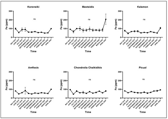 Leaf Fe content fluctuated to a lesser extent throughout the year when compared to Ca. ‘Mastoidis’ showed the highest leaf Fe concentration (95.9 ppm), while all the other varieties demonstrated a lower Fe concentration, with ‘Amfissis’ showing the lowest (62.9 ppm). In a previous study of Greek varieties, ‘Kothreiki’ absorbed a significantly greater quantity of Fe per plant when compared with ‘Koroneiki’ [26]. The maximum concentration was observed in April (114.2 ppm) and the minimum in June (53 ppm). Leaf Fe concentration showed significant differences between variety and time but not their interaction (Table 1). Fe concentration increased in the order: June < October, December, March < September, January, February, November < July, and August < May < April (Figure 4). Mean leaf Fe concentration significantly decreased in June when compared to May, July, August, and April; however, this decrease was not significant when compared to September, October, November, December, January, February, and March (Table 1).