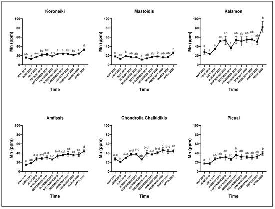 Chatzistathis et al. [25] indicated that the leaf Mn concentration of ‘Koroneiki’ plants gradually increased, reaching the maximum from August to early September, and afterwards declined in October, independently of soil type. A study on the Greek olive variety ‘Kothreiki’ [8] also reported an increase from April to May and July to August, while a decrease was found during the winter, indicating the reduced absorption of Mn by the trees due to low temperatures of this period. Finally, it should be pointed out that [26] supported that ‘Koroneiki’ could be considered as an Mn- and Fe-efficient variety when compared with ‘Kothreiki’ because of its better transport system of these two elements from the root to the shoot.