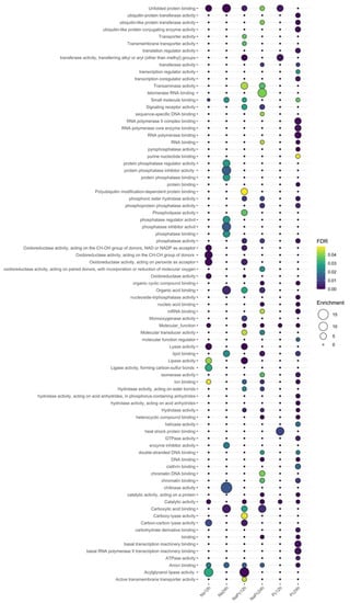 To determine the biological functions of the DEGs between the control and treatments, genes were annotated using the Gene Ontology (GO) database and divided into three major functional categories: molecular function (MF), cellular (CC), and biological process (BP). A total of 8591 genes were found expressed differentially, but only 3870 genes reported MF, 6101 for BP, and 5865 genes for CC (Figure 3). Analyzing the MF of the genes, 50.2% corresponded to catalytic activity (GO: 0003824), 29.1% corresponded to binding proteins (GO:0005488), and 9.7% corresponded to molecular function regulator (GO: 0098772). The principal groups of BP were cellular process (GO: 0009987, 36.7%), metabolic process (GO: 0008152, 29.5%), and biological regulation (GO: 0065007, 12.7%). The CC genes were formed by 50.1% cellular anatomical entity (GO:0110165), 40.3% intracellular (GO: 0005622), and 9.6% protein-containing complex (GO 0032991).