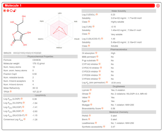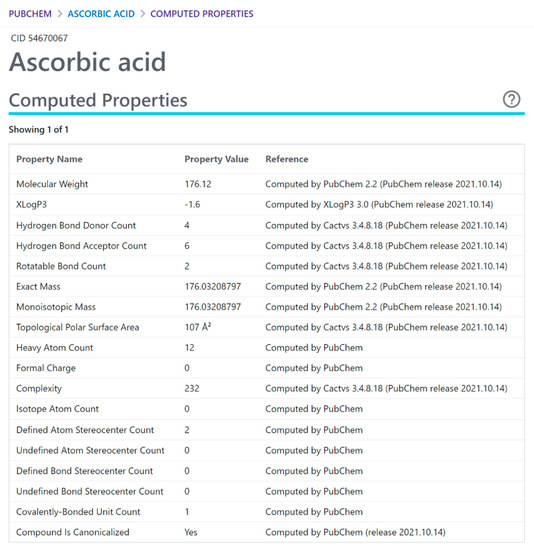 | Ascorbic acid | ✔ | 2/LogP < −0.4 A < 40 | ✔ | 1/MW < 200 | ✔ | High | ||