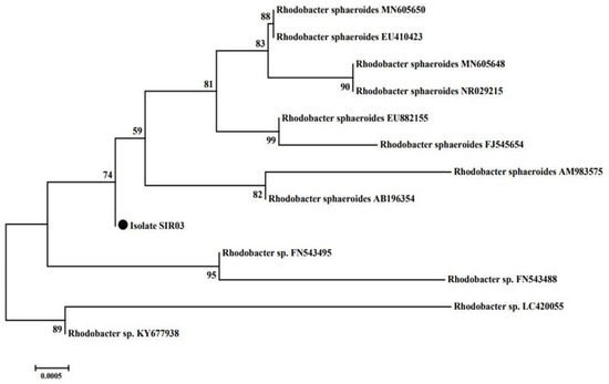 Isolate SIR03 led to significant improvement in sesame seedling growth and GAs production until the end of observation; therefore, SIR03 was molecularly identified by amplifying and sequencing 16S rRNA. The identification results showed that the closest identity of 95% was to the Rhodobacter sp. FN543495, and with 74% identity to the Rhodobacter sphaeroides species, which further shows a close 82% identity of isolate SIR03 to Rhodobacter sphaeroides AB196354. This suggests the isolate SIR03 has the closest similarity to the Rhodobacter sphaeroides/Rhodobacter species (Figure 3). The obtained nucleotide sequences were submitted to the NCBI GenBank database with accession no. MW345829.