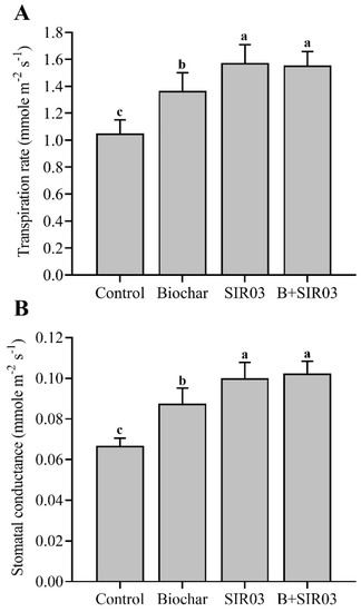 Transpiration is an important factor in enabling plants to maintain water absorption for a healthy life cycle. As the transportation rate increases, water absorption increases, and the stomata opening and closing in response also have effects. The current results show that the sole biochar significantly improved the transpiration rate by 30.7% and stomatal conductance by 31.8% compared to control plants (non-inoculated); conversely, the combined application of the SIR03 strain and biochar caused further increases in the transpiration rate and stomatal conductance, by 48.1% and 54.5%, respectively, compared to control plants, while showing non-significant differences compared to sole SIR03 treated plants (Figure 4A,B).